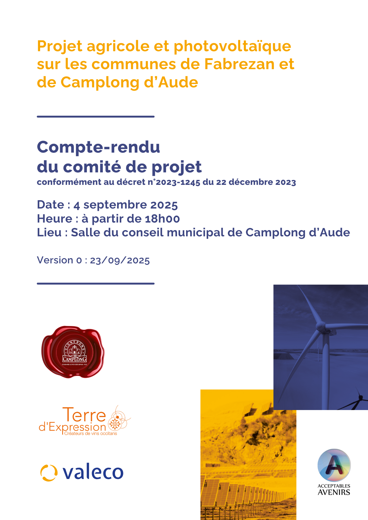 Afin de garantir que le projet agricole et photovoltaïque à Fabrezan et Camplong-d’Aude réponde aux attentes des acteurs locaux, les Caves coopératives Terre d’Expression et Vignerons de Camplong, en collaboration avec VALECO, ont mis en place une démarche de dialogue territorial. Ce processus inclut plusieurs étapes, telles que des rencontres avec le public, afin de co-construire un projet harmonieux, respectueux des enjeux locaux et environnementaux.
